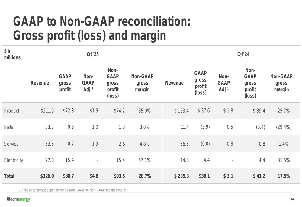 Bloom Energy reported substantial year-over-year improvements across all key financial metrics for Q1 2025. Revenue reached $326.0 million, representing a 38.6% increase compared to Q1 2024’s $235.3 million. This strong top-line growth was accompanied by significant margin expansion.