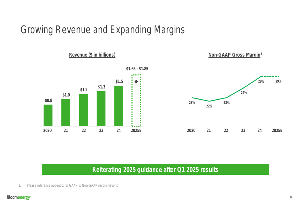 For the full year 2025, Bloom Energy expects total revenue between $1.65 billion and $1.85 billion, representing continued growth from 2024’s $1.5 billion. The company projects a non-GAAP gross margin of approximately 29% and non-GAAP operating income between $135 million and $165 million.