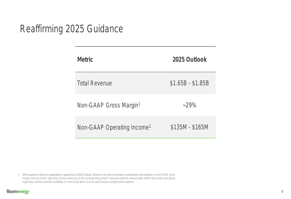 Bloom Energy has reaffirmed its guidance for 2025, maintaining confidence in its growth trajectory despite potential challenges. The company’s outlook remains positive, as shown in the following guidance summary: