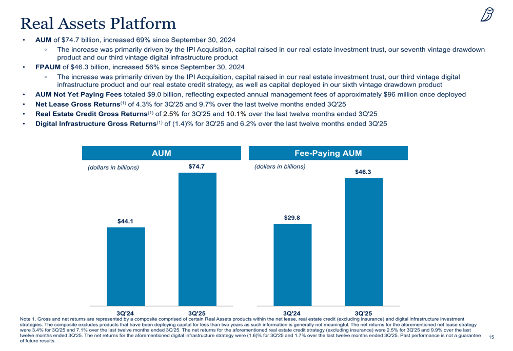 The Real Assets platform demonstrated exceptional growth, with AUM increasing 69% year-over-year to $74.7 billion. This segment, which includes digital infrastructure investments, has become an increasingly important component of Blue Owl’s business strategy.