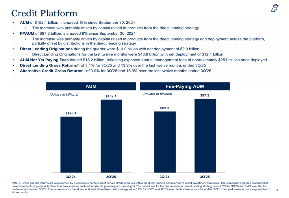 The Credit platform, Blue Owl’s largest by assets, grew its AUM by 18% to $152.1 billion. Direct lending originations during the quarter totaled $10.9 billion, with gross returns of 3.1% for the quarter and 13.2% over the last twelve months.