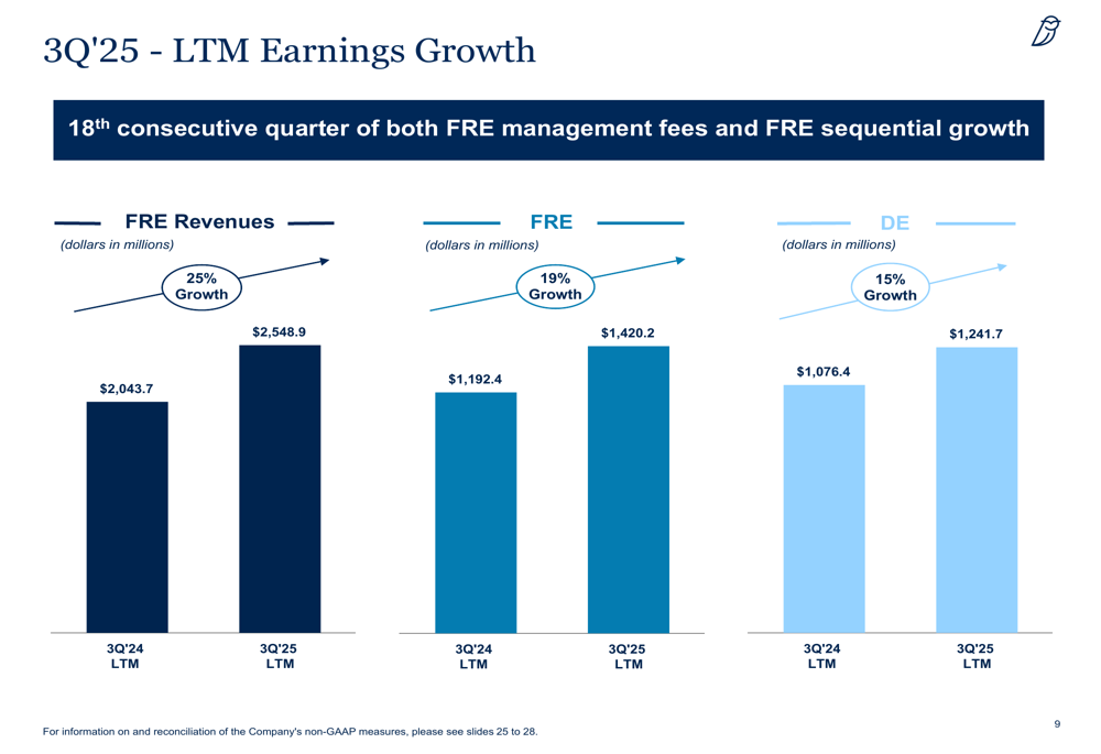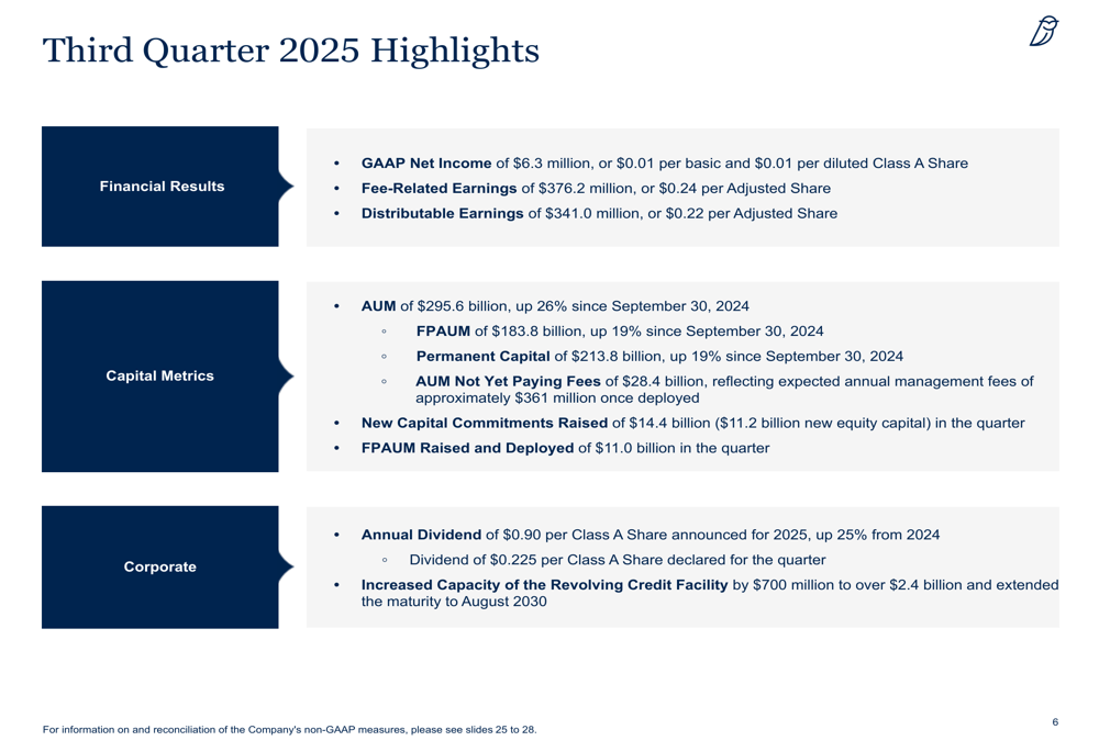 Blue Owl posted GAAP net income of $6.3 million, with fee-related earnings (FRE) of $376.2 million (up 19% year-over-year) and distributable earnings of $341.0 million (up 15%). Management fees showed particularly strong growth, increasing 29% compared to the previous year.