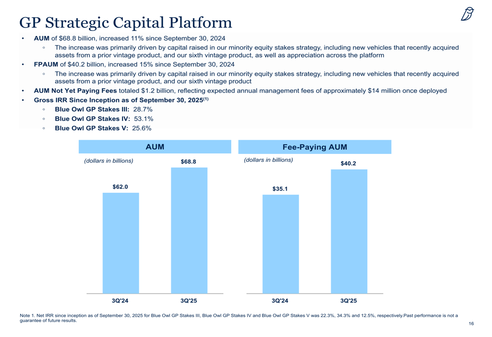 The GP Strategic Capital platform increased its AUM by 11% to $68.8 billion, with strong performance across its funds. Blue Owl reported impressive gross IRRs since inception for its GP Stakes funds, with Blue Owl GP Stakes IV leading at 53.1%.