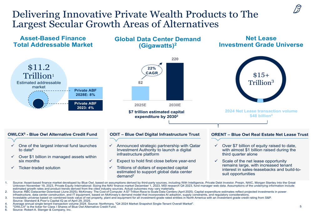 Blue Owl highlighted three key secular growth areas driving its strategy: Asset-Based Finance (with an $11.2 trillion total addressable market), Global Data Center Demand (projected 22% CAGR from 2025-2030), and Net Lease Investment Grade Universe (over $15 trillion market).