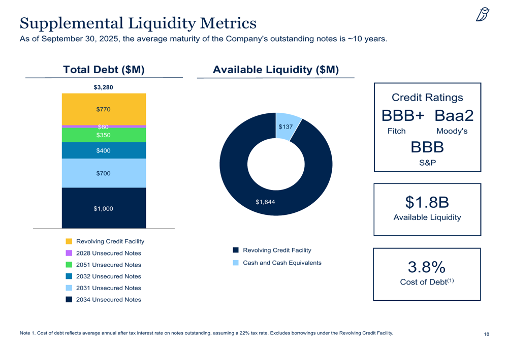 Blue Owl maintains a strong financial position with $1.8 billion in available liquidity and an average debt maturity of approximately 10 years. The company’s cost of debt stands at 3.8%, with investment-grade ratings from all three major rating agencies.