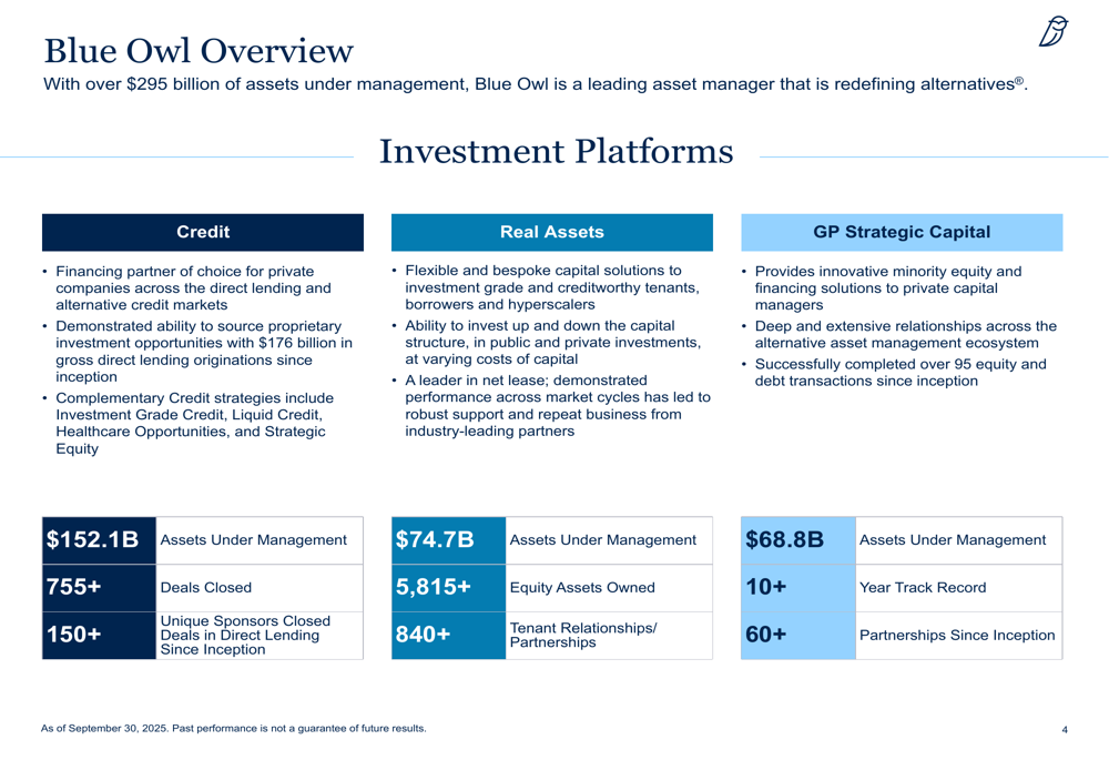 Blue Owl operates across three multi-strategy platforms, with each showing growth but at varying rates. The company’s overview illustrates its diverse investment approach: