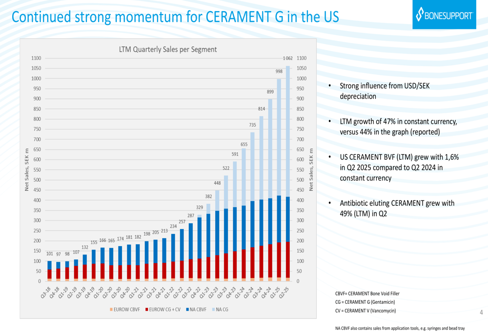 The North American market continues to be the primary growth driver for Bonesupport, with sales reaching SEK 236 million in Q2 2025, a 36% increase from Q2 2024. When adjusted for currency effects, this growth was even more substantial at 49%. The strong performance was largely attributed to CERAMENT G, which generated USD 18.3 million in sales, representing an impressive 84% growth.