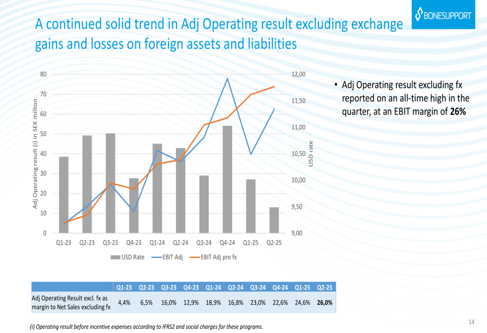 Bonesupport’s financial health continues to strengthen, with the company reporting consistent improvement in its operating results. The adjusted operating result reached an all-time high in Q2 2025, with an EBIT margin of 26%.