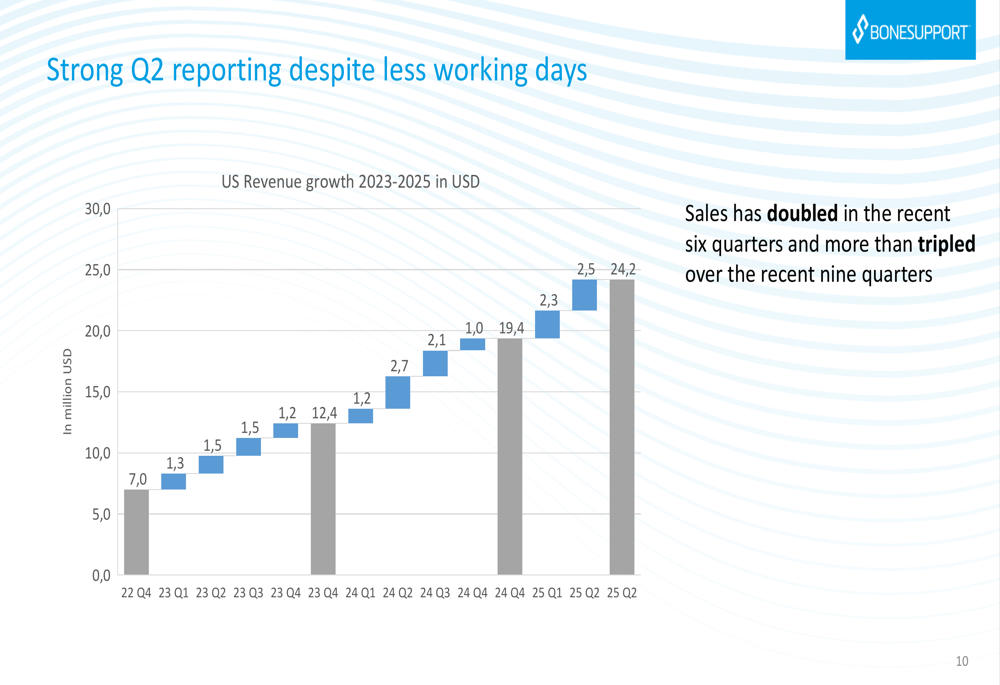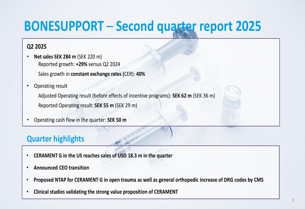 In summary, Bonesupport’s Q2 2025 results demonstrate the company’s continued success in executing its growth strategy, particularly in the US market. With record profitability, strong cash flow generation, and strategic expansion plans, Bonesupport appears well-positioned for sustained growth in the orthobiologic market.