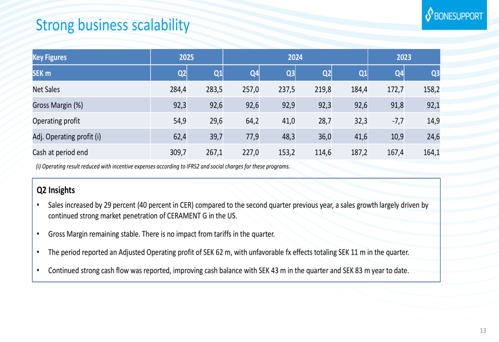 Bonesupport delivered exceptional financial results in Q2 2025, with net sales reaching SEK 284 million, representing a 29% increase compared to the same period last year. When adjusted for currency effects, growth was even more impressive at 40%.