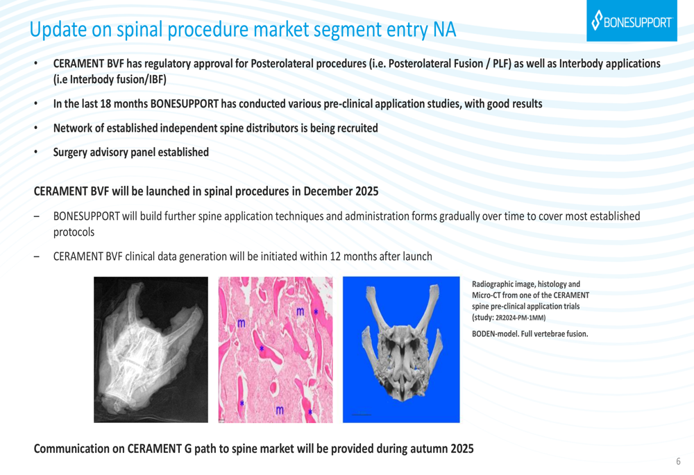A key strategic focus for Bonesupport is its planned entry into the spinal procedure market in North America. The company announced that CERAMENT BVF will be launched for spinal procedures in December 2025, with regulatory approvals already in place for both Posterolateral and Interbody applications.
