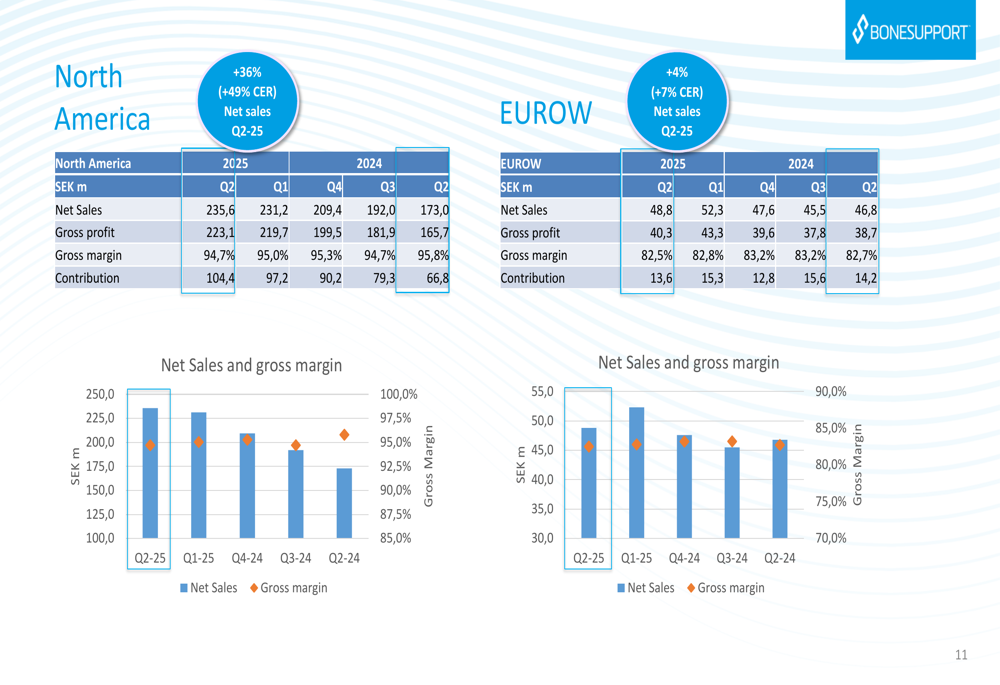 Notably, Bonesupport maintains exceptionally high gross margins in North America at approximately 95%, contributing significantly to its overall profitability.