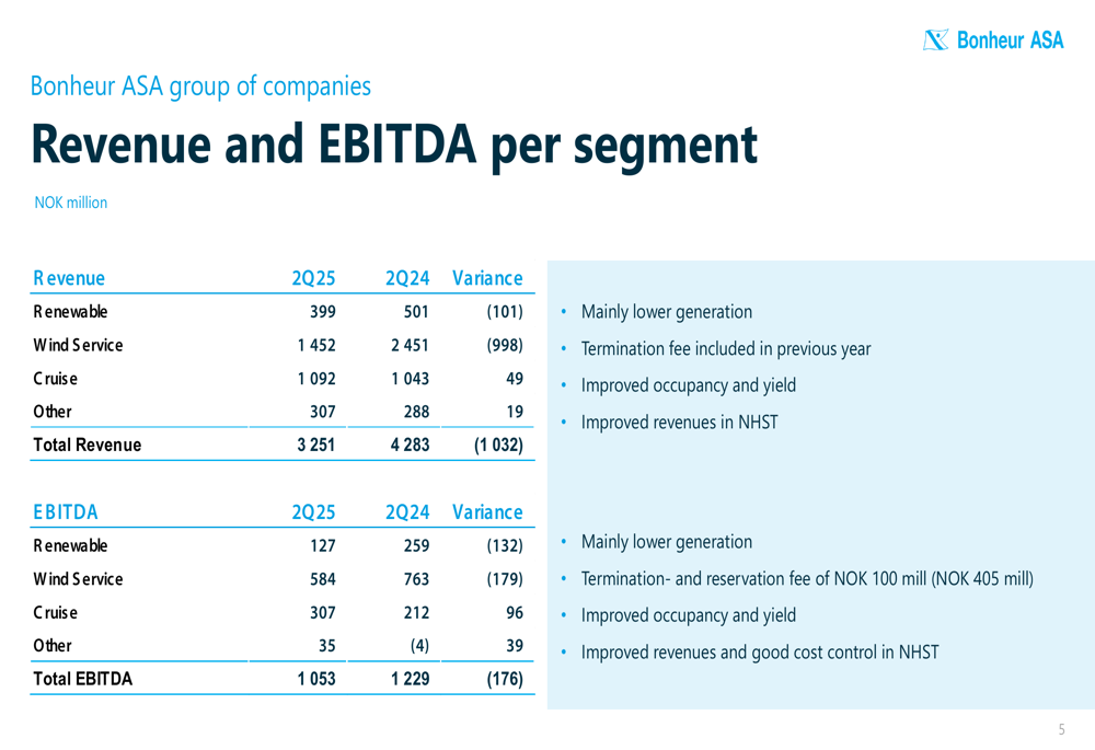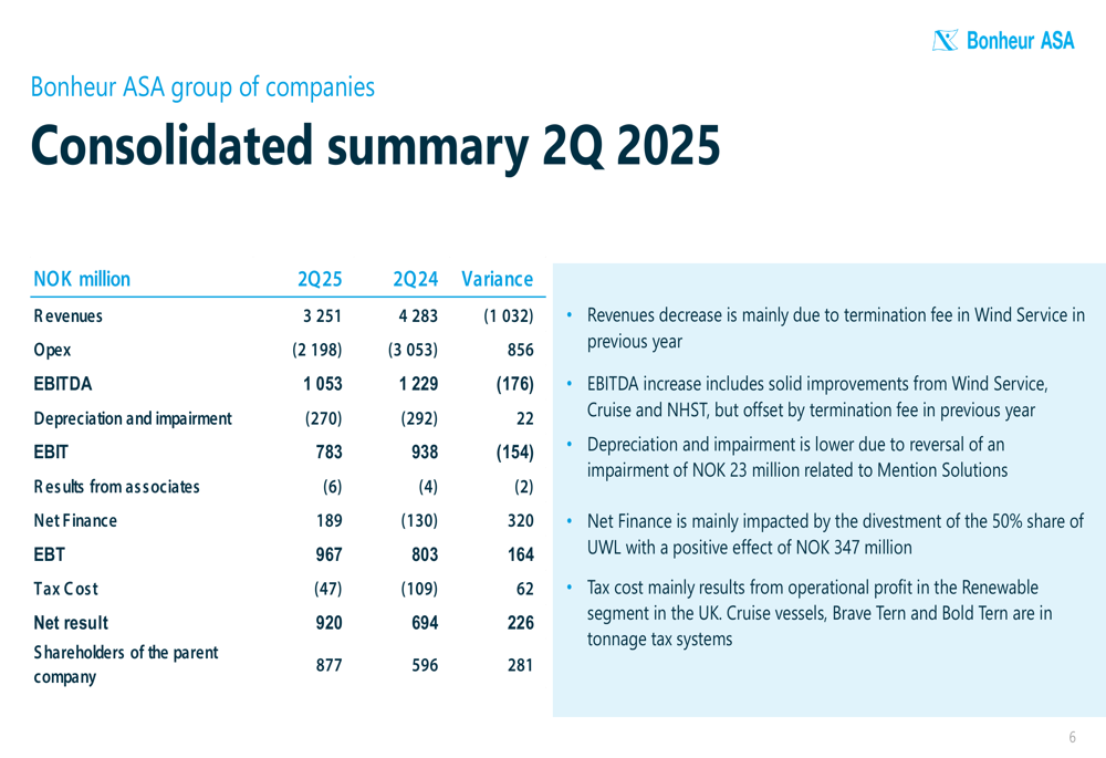 Bonheur reported consolidated revenues of NOK 3,251 million for Q2 2025, down from NOK 4,283 million in the same period last year. EBITDA declined to NOK 1,053 million from NOK 1,229 million in Q2 2024. Despite these decreases, the company’s net result improved significantly to NOK 920 million, up from NOK 694 million in the previous year, representing a NOK 226 million increase.