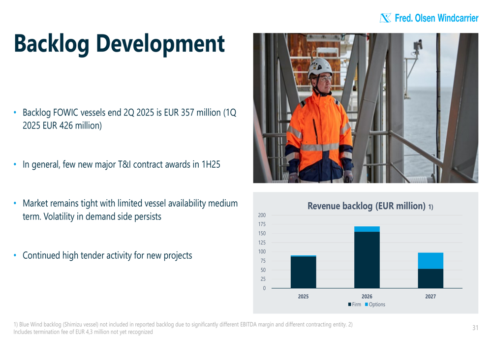 Fred. Olsen Windcarrier reported a backlog development of EUR 357 million at the end of Q2 2025, down from EUR 426 million in Q1 2025. The company noted that the vessel market remains tight with limited availability in the medium term: