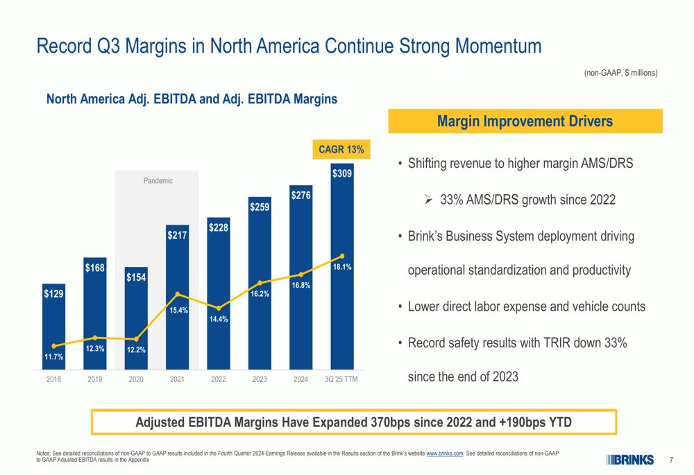 North America has been a particular bright spot for margin expansion, with adjusted EBITDA margins reaching 18.1% in Q3 2025 (trailing twelve months), representing a 370 basis point improvement since 2022. The company attributes this success to shifting revenue to higher-margin AMS/DRS services, operational standardization through the Brink's Business System, lower direct labor expenses, and improved safety results.
