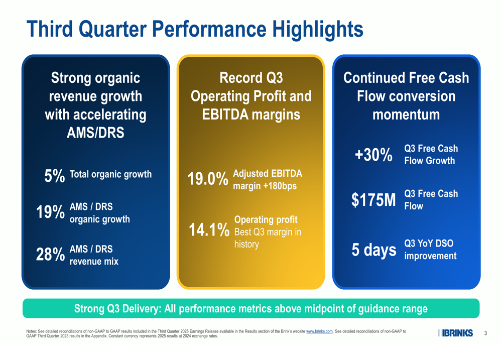 Brink's third quarter was characterized by strong organic growth and record profit margins. The company achieved 5% total organic growth, with its ATM Managed Services and Digital Retail Solutions (AMS/DRS) segment delivering an impressive 19% organic growth rate.