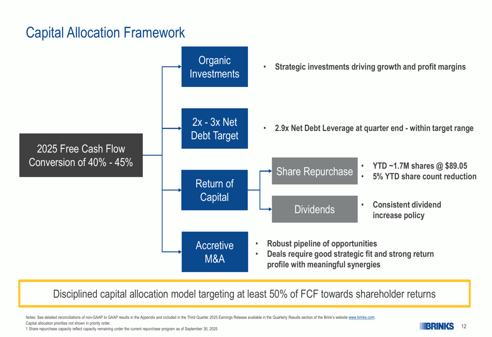 The company's capital allocation framework prioritizes shareholder returns, with a target of returning at least 50% of free cash flow to shareholders through dividends and share repurchases. Year-to-date, Brink's has repurchased approximately 1.7 million shares at an average price of $89.05, reducing its share count by 5%.