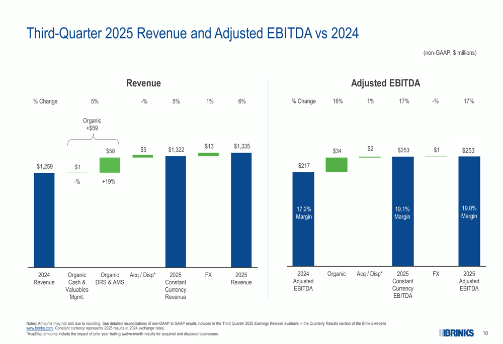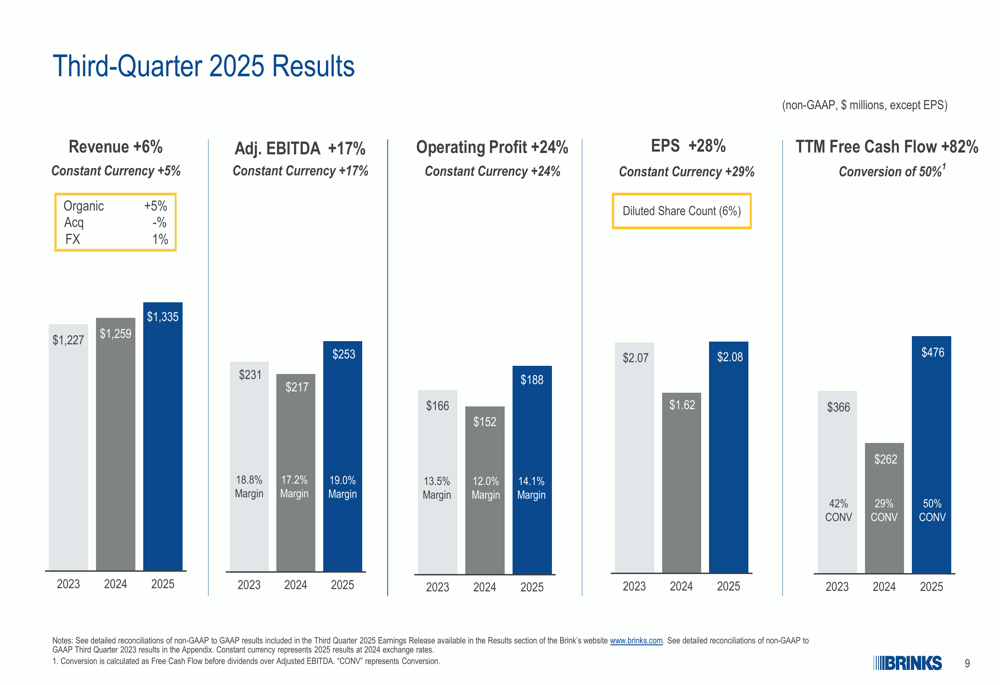 The following chart illustrates Brink's third-quarter 2025 results compared to the previous two years: