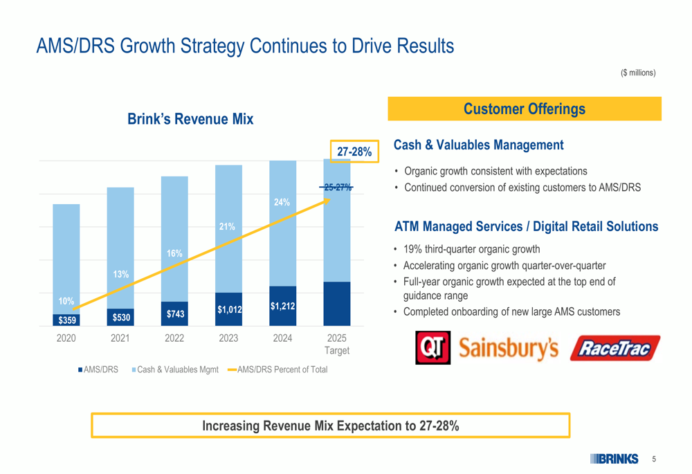 Brink's continues to execute on its strategic shift toward higher-margin ATM Managed Services and Digital Retail Solutions (AMS/DRS). This segment now represents 28% of the company's revenue mix, up from just 10% in 2020, and is on track to reach the company's 2025 target of 27-28%.