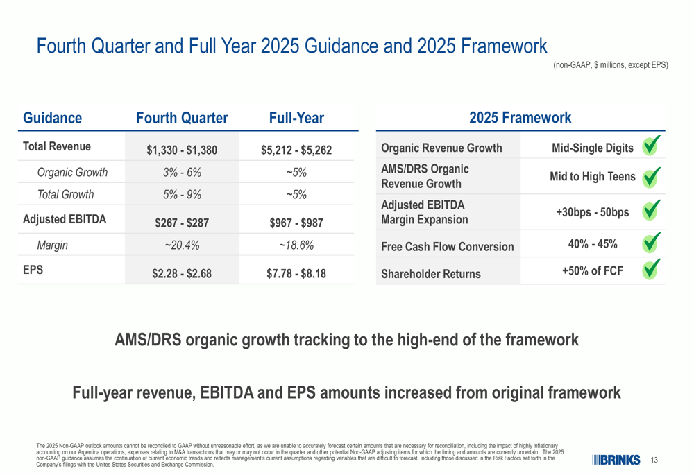 For the fourth quarter of 2025, Brink's provided guidance for total revenue between $1,330 million and $1,380 million, with organic growth of 3-6% and total growth of 5-9%. The company expects adjusted EBITDA between $267 million and $287 million, with a margin of approximately 20.4%, and EPS between $2.28 and $2.68.