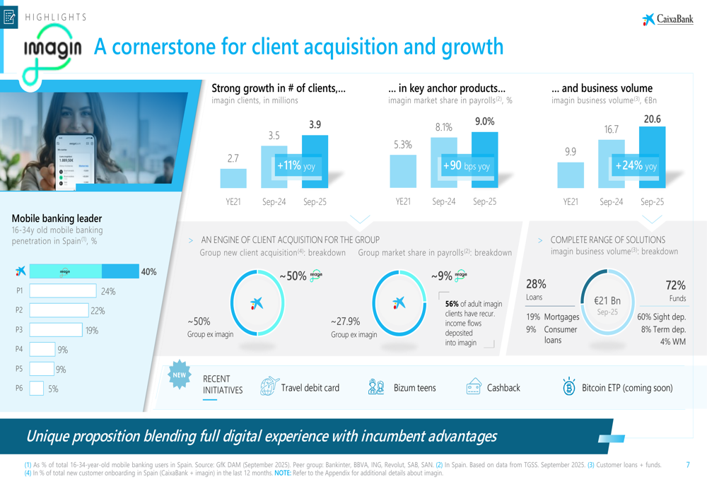 CaixaBank’s digital banking platform, imagin, has become a cornerstone for client acquisition and growth. The platform reached 3.9 million clients, representing 11% year-over-year growth, and has become an effective engine for attracting new customers to the group.