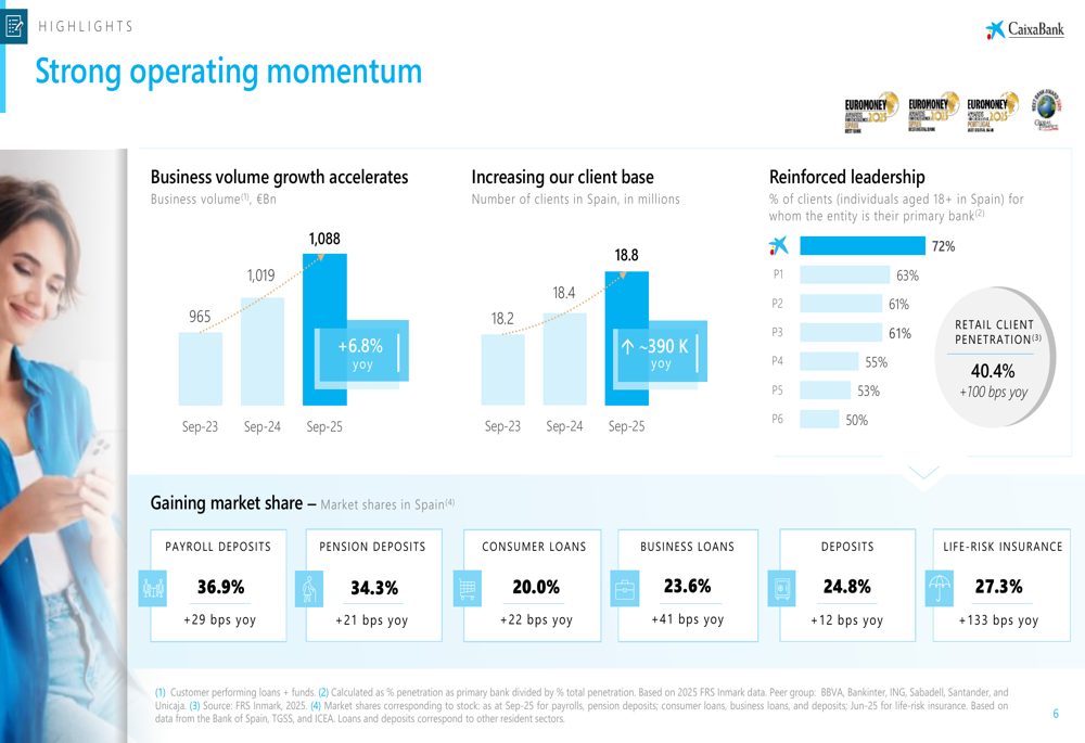 The bank strengthened its leadership position with retail client penetration increasing to 40.4% (+100 bps yoy), with 72% of individual clients in Spain using CaixaBank as their primary bank. This strong client relationship has translated into market share gains across all key products.