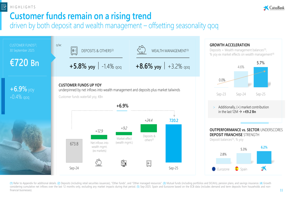 Customer funds maintained their rising trend, growing to €720 billion with deposits up 5.8% year-over-year and wealth management balances increasing 8.6%: