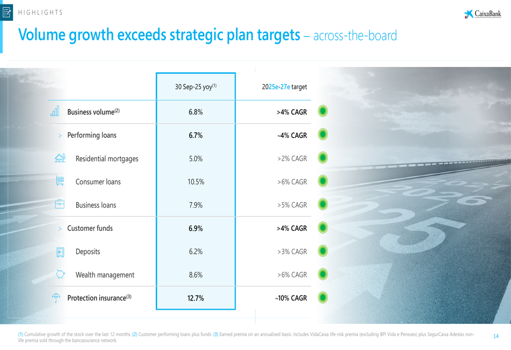 CaixaBank’s total business volume grew 6.8% year-over-year to €1,088 billion, significantly exceeding the strategic plan target of 4% CAGR. The bank’s client base expanded by approximately 390,000 year-over-year to reach 18.8 million clients in Spain.