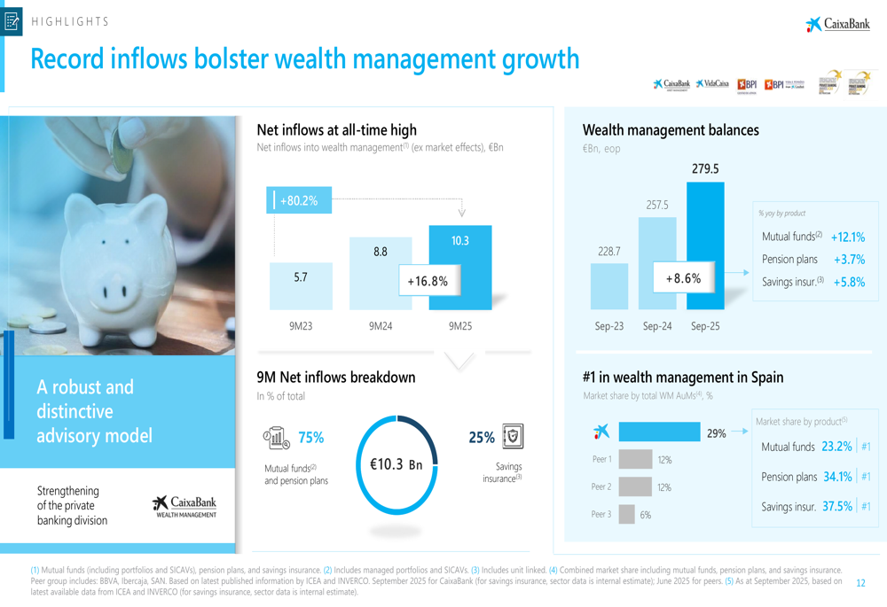 Wealth management has been another area of strong performance, with record net inflows of €10.3 billion, up 16.8% compared to the first nine months of 2024. CaixaBank maintains its position as the market leader in wealth management in Spain.