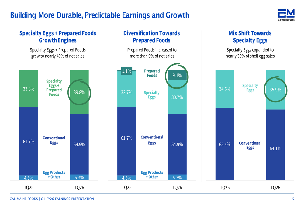 Specialty eggs and prepared foods increased from 33.8% of net sales in Q1 FY25 to 39.8% in Q1 FY26, while conventional eggs decreased from 61.7% to 54.9%. Notably, prepared foods grew from just 1.1% to 9.1% of net sales year-over-year, reflecting the company’s strategic acquisition of Echo Lake Foods.