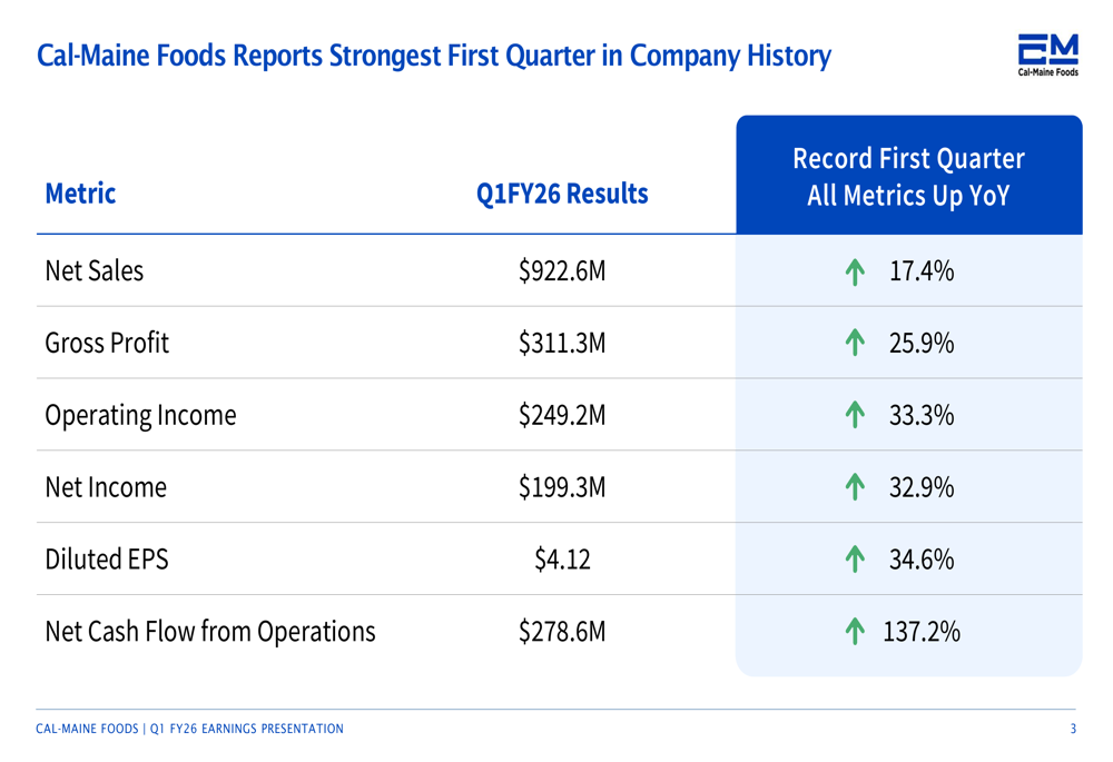 Cal-Maine reported exceptional financial results for Q1 FY26, marking the strongest first quarter in company history. Net sales reached $922.6 million, up 17.4% year-over-year, while net income rose 32.9% to $199.3 million. Diluted earnings per share increased 34.6% to $4.12, and operating cash flow more than doubled, jumping 137.2% to $278.6 million.