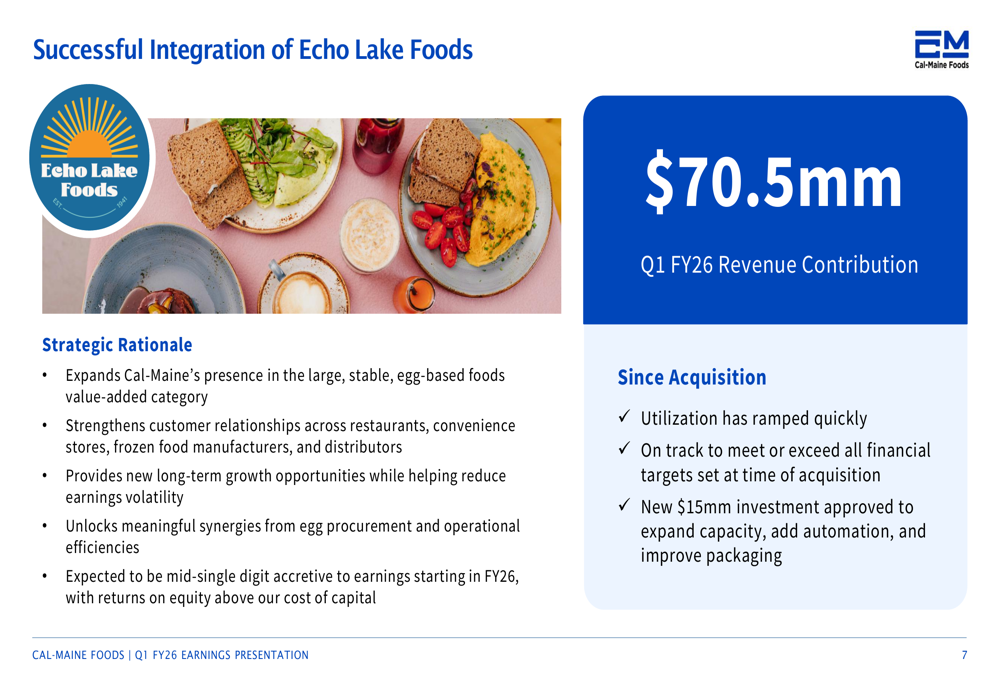 Cal-Maine reported that utilization at Echo Lake Foods has ramped up quickly and is on track to meet or exceed all financial targets set at the time of acquisition. The company has approved a new $15 million investment to expand capacity, add automation, and improve packaging at Echo Lake facilities.