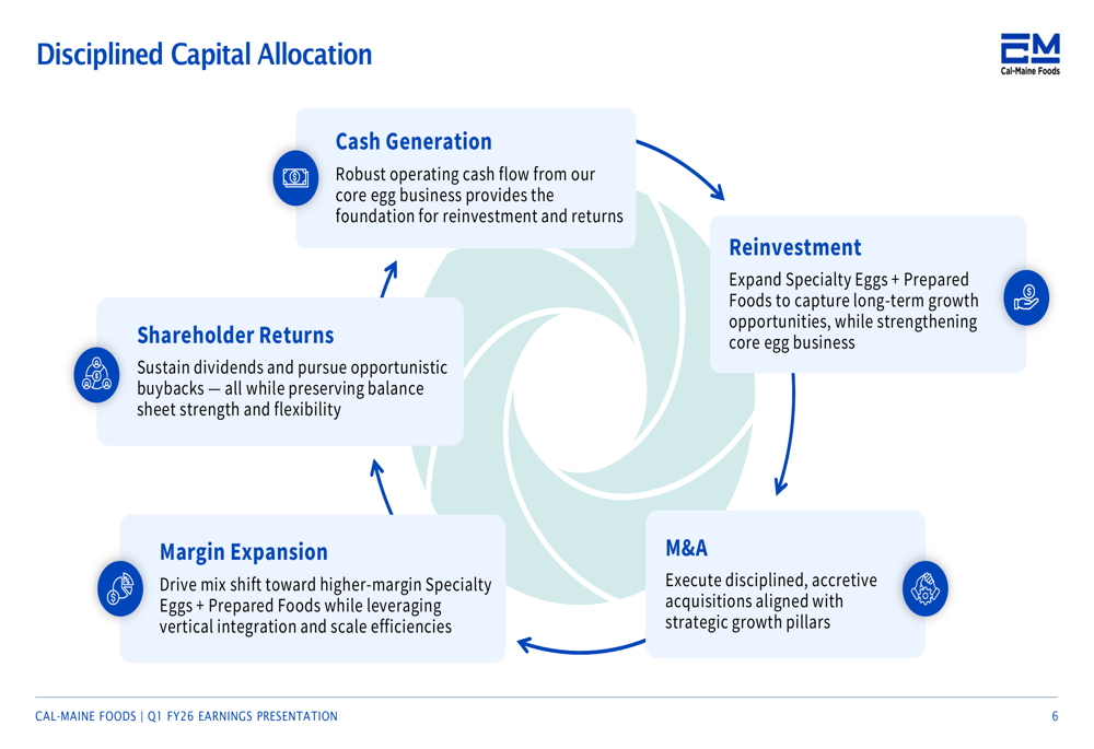 Cal-Maine outlined its disciplined capital allocation strategy, which includes returning value to shareholders while funding strategic growth: