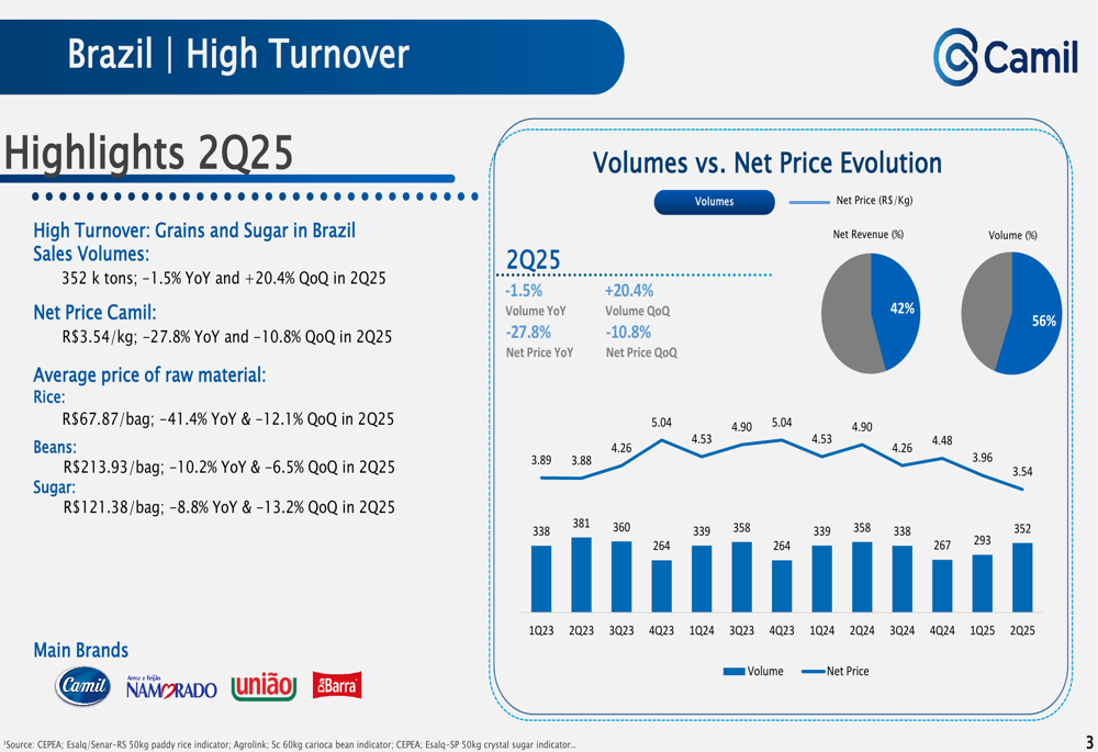 Camil Alimentos SA (BVMF:CAML3) presented its Q2 2025 earnings results on October 10, 2025, revealing a mixed performance characterized by strong volume growth counterbalanced by significant price pressures. The Brazilian food producer reported a net revenue decline of 8.6% year-over-year to R$3.0 billion, while total volume increased 6.8% to 634,000 tons.