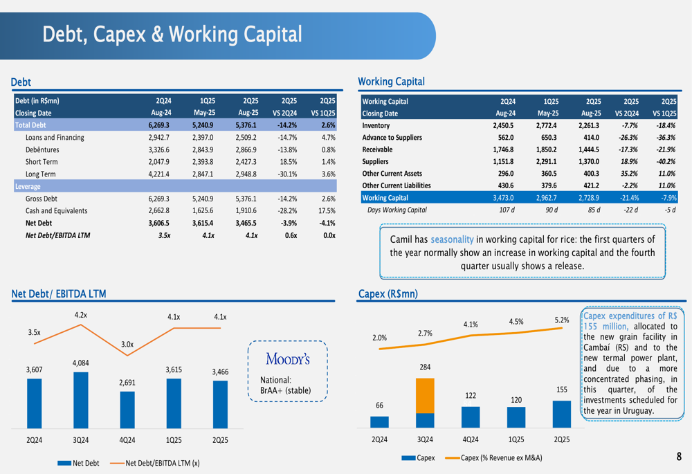 Camil continues to focus on debt management, with a stated goal of reducing its net debt to EBITDA ratio to approximately 2x. As of Q2 2025, this ratio stood at 4x, unchanged from the previous quarter, indicating that debt reduction remains a work in progress.
