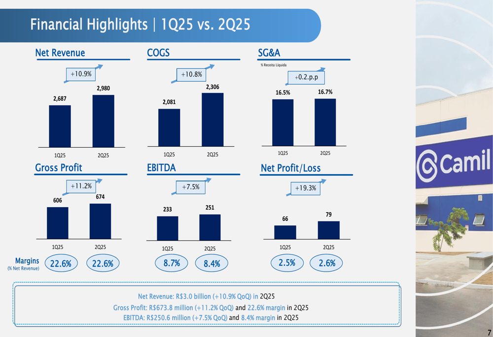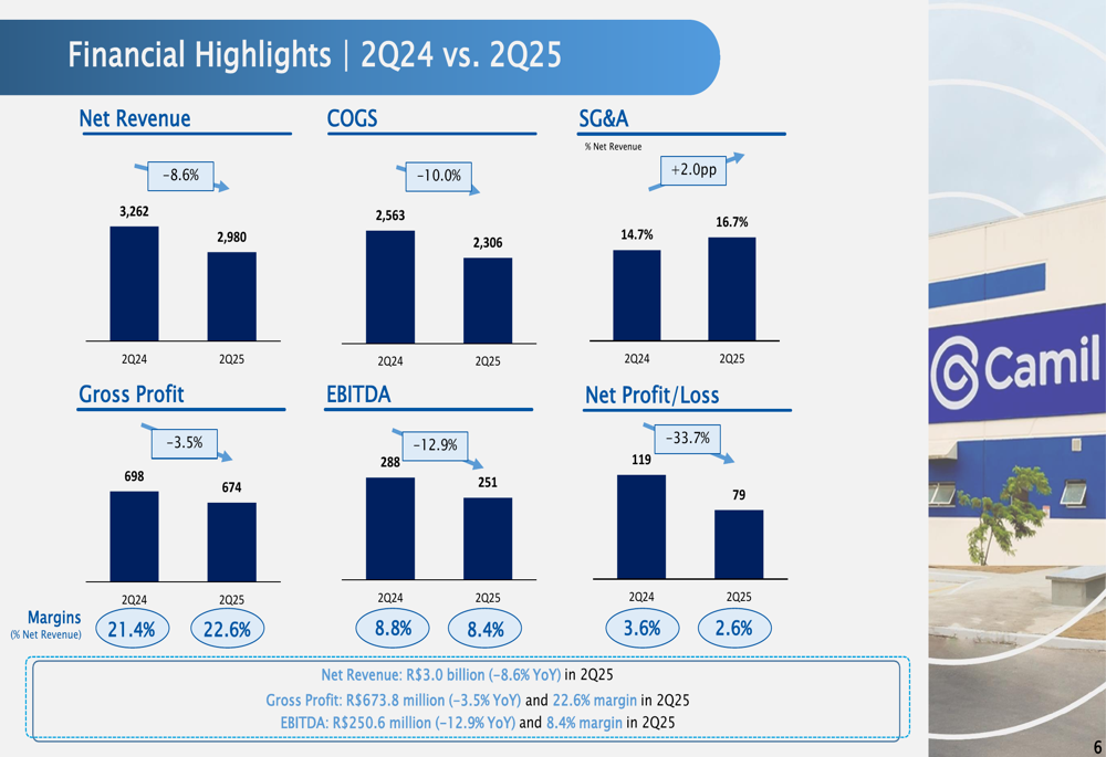 Camil’s second quarter results showed sequential improvement from Q1 2025 but remained below year-ago levels for key profitability metrics. EBITDA fell 12.9% year-over-year to R$251 million but improved 7.5% quarter-over-quarter. Similarly, EBITDA margin contracted to 8.4%, representing a 0.4 percentage point decline from the same period last year.