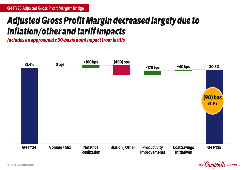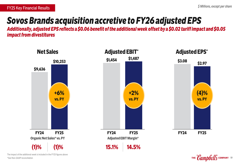 For the full fiscal year 2025, Campbell’s reported net sales of $10.25 billion, a 6% increase versus the prior year, though organic net sales declined 1%. Adjusted EBIT grew 2% to $1.49 billion, while adjusted EPS decreased 4% to $2.97.