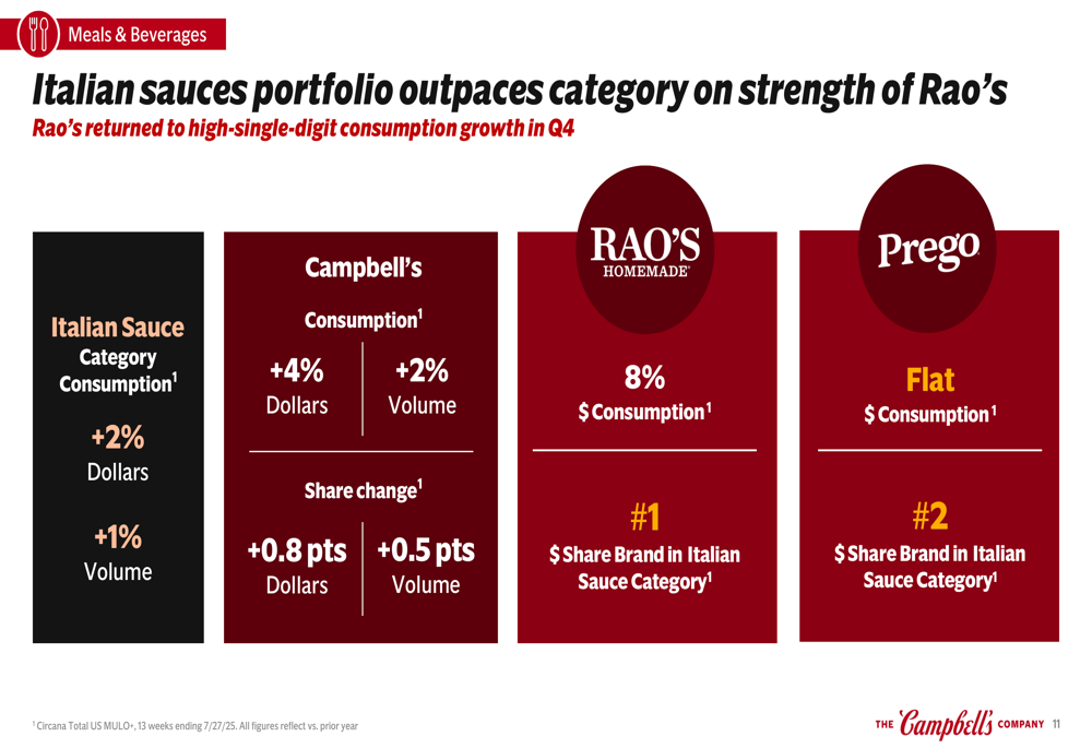 Campbell’s soup portfolio showed mixed results with flat performance in wet soup and condensed categories, while ready-to-serve declined 6%. The company’s Italian sauces portfolio was a particular bright spot, outpacing category growth with Rao’s returning to high-single-digit consumption growth (8%) and maintaining its position as the #1 share brand in the category: