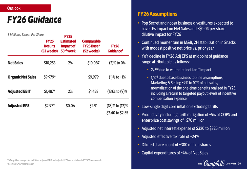Looking ahead to fiscal 2026, Campbell’s provided guidance that reflects its focus on sustainable growth while managing near-term cost pressures. The company expects net sales growth of -1% to +1%, adjusted EBIT of approximately $1.46 billion, and adjusted EPS of around $2.91.