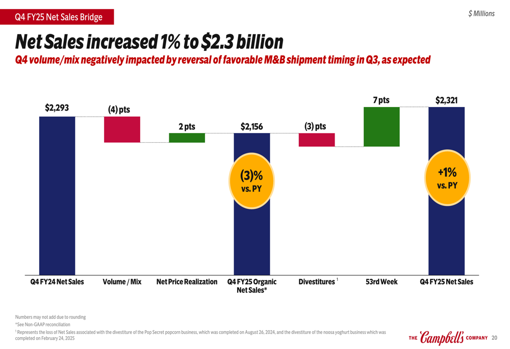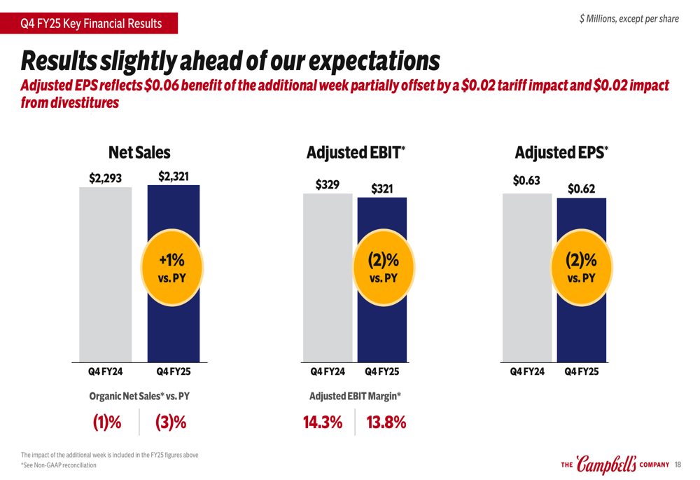 Campbell’s reported Q4 net sales of $2.32 billion, representing a 1% increase compared to the prior year, while organic net sales declined 3%. Adjusted EBIT fell 2% to $321 million with a margin of 13.8%, and adjusted EPS decreased 2% to $0.62. The company noted that Q4 volume/mix was negatively impacted by the reversal of Q3 shipment timing benefits.