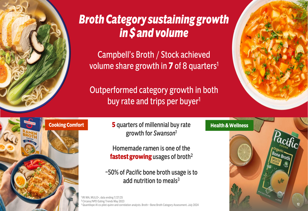 The broth category also demonstrated sustained growth, with Campbell’s broth/stock achieving volume share growth in seven of eight quarters and outperforming category growth in both buy rate and trips per buyer: