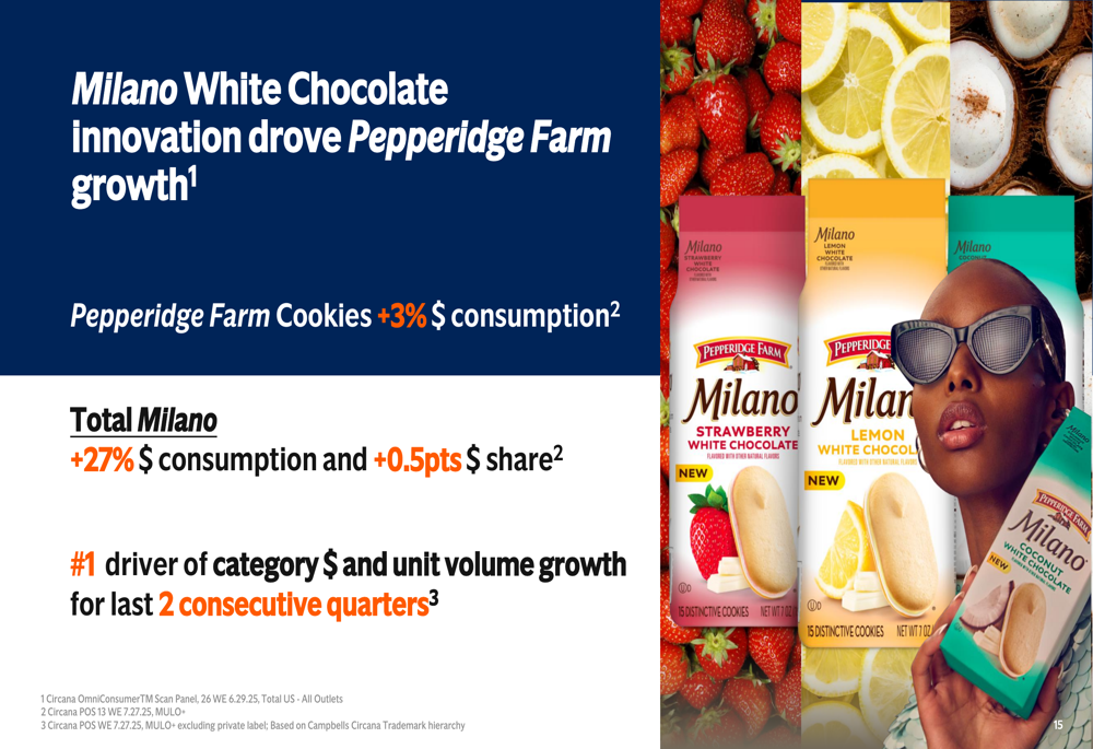 A standout performer was Milano cookies, particularly the White Chocolate innovation, which drove Pepperidge Farm cookies to 3% dollar consumption growth. Total Milano sales increased 27% with a 0.5 point share gain, making it the #1 driver of category dollar and unit volume growth for two consecutive quarters: