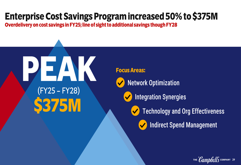 Campbell’s announced a significant expansion of its Enterprise Cost Savings Program, increasing the target by 50% to $375 million through fiscal 2028. The program encompasses network optimization, integration synergies, technology and organizational effectiveness improvements, and indirect spend management.