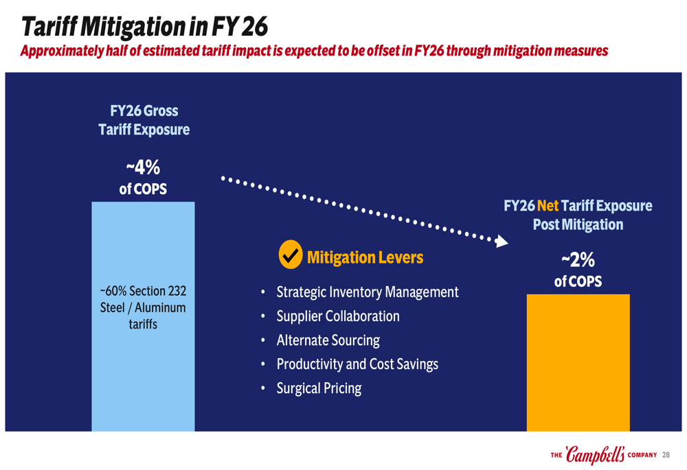 The company is also implementing a comprehensive tariff mitigation strategy for fiscal 2026, designed to offset approximately half of the estimated tariff impact through strategic inventory management and other measures. The net tariff exposure is expected to be around 2% of cost of products sold, with approximately 60% coming from Section 232 steel and aluminum tariffs: