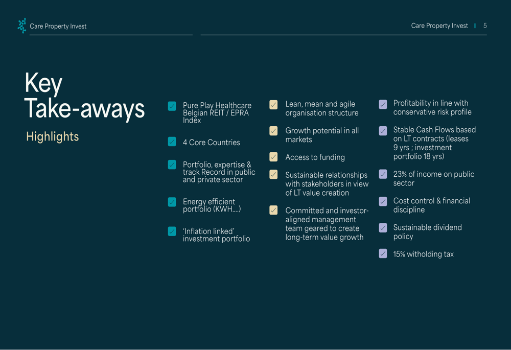 As shown in the company’s leadership slide, Care Property Invest is led by CEO Patrick Couttenier and CFO Filip Van Zeebroeck: