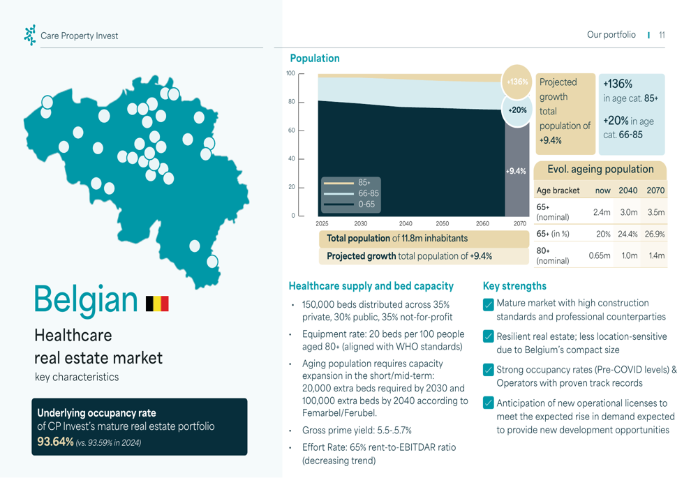 A key driver of Care Property Invest’s strategy is the aging demographic trend across its markets. The company highlighted significant projected population growth in the elderly segments across all four countries, with particularly strong growth in the 85+ age group.