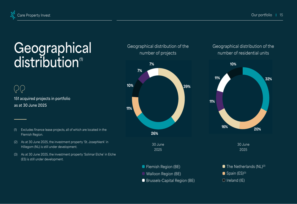 Care Property Invest maintains a focused strategy on four core European markets within the Eurozone/EEA, with no plans to enter additional markets in the near term. The portfolio is distributed across Belgium (63%), the Netherlands (20%), Spain (9%), and Ireland (8%).