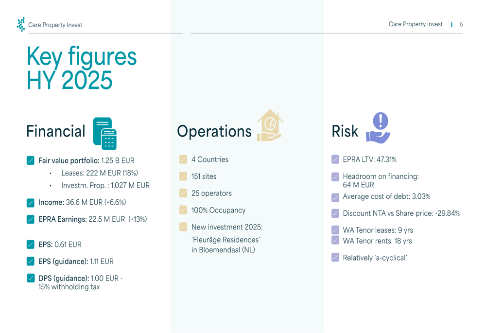 Care Property Invest reported impressive financial results for the first half of 2025, with EPRA earnings increasing 13% year-over-year to €22.5 million. Total income rose 6.6% to €36.6 million, while earnings per share reached €0.61 for the half-year period.