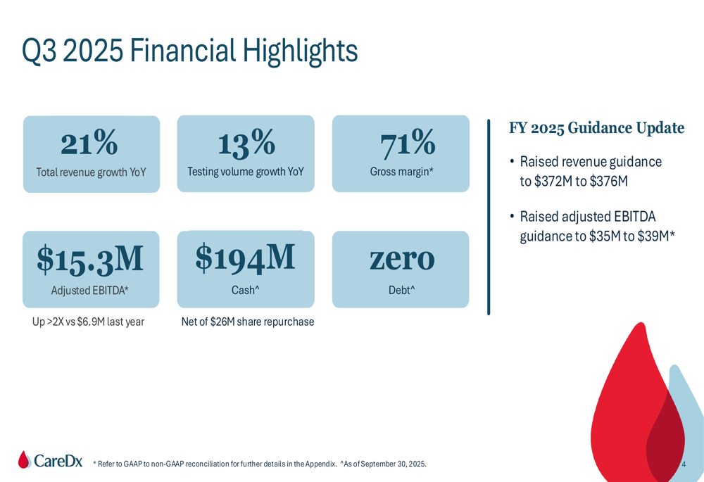 Based on its strong Q3 performance, CareDx has raised its full-year 2025 guidance. The company now expects revenue between $372 million and $376 million, up from the previous guidance of $367 million to $373 million. Adjusted EBITDA guidance has also been raised to $35 million to $39 million, compared to the previous range of $29 million to $33 million.