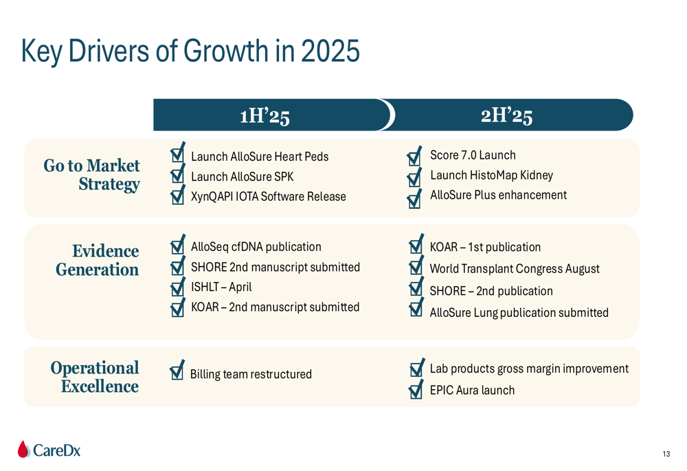 CareDx has identified several key drivers of growth for the remainder of 2025. In the second half of the year, the company plans to launch Score 7.0, HistoMap Kidney, and enhance AlloSure Plus. On the evidence generation front, CareDx expects publications from the KOAR registry and SHORE study, along with participation in the World Transplant Congress in August. Operational excellence initiatives include lab products gross margin improvement and the EPIC Aura launch.